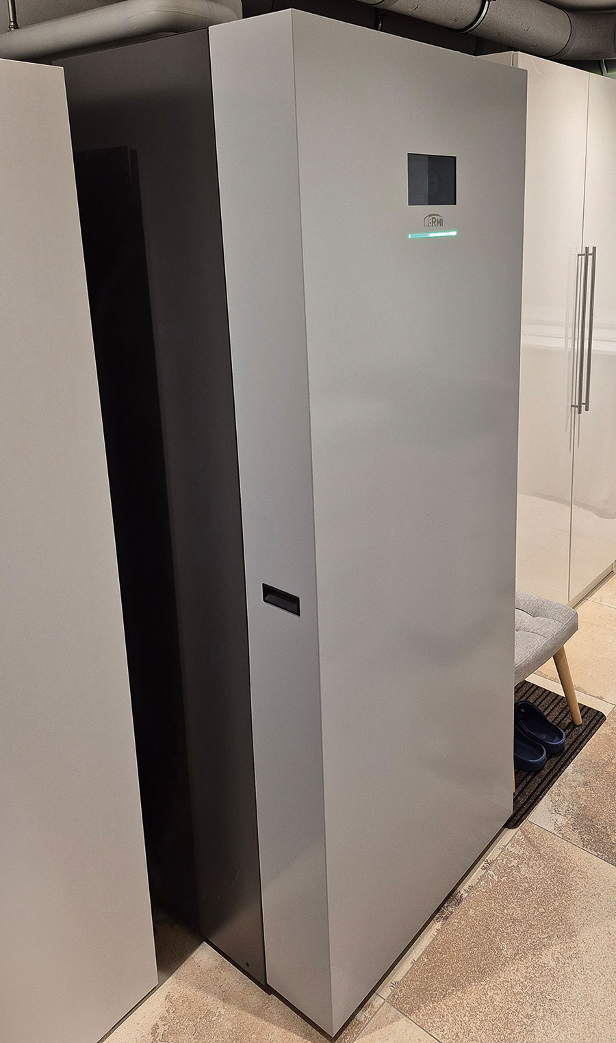 Für die Wärmeverteilung wurde das Tacker-Flächenheizungssystem „x-net C12“ eingesetzt. Die Platten lassen sich mit Folienüberstand und Selbstklebestreifen fließestrichdicht verbinden. Im Obergeschoss ergänzt eine Wandheizung/-kühlung nach dem Putzsystem „C21“ das Konzept. „Das zentrale Lüftungsgerät „x-well S280“ sorgt für kontinuierlichen Luftaustausch und erreicht mit über 90% Wärmerückgewinnung die Energieeffizienzklasse A+“, heißt es von Kermi. Die Lüftungsrohre für diese Lösung wurden bereits im Rohbau verlegt.