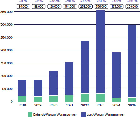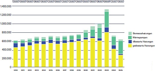 Während Wärmepumpen zuletzt mit rund 299 000 verkauften Geräten und einem Wachstum von 55 % gegenüber dem Vorjahr zulegten, können sie allein den Einbruch im Gesamtmarkt nicht kompensieren. So wurde das noch unter der Ampel beschlossene Ziel von 500 000 installierten Wärmepumpen pro Jahr ab 2024 das zweite Jahr in Folge deutlich verfehlt. Auch Heizsysteme auf Basis von Biomasse, etwa Pelletanlagen, verzeichneten eine leichte Erholung, liegen mit 29 000 abgesetzten Geräten jedoch weiterhin auf niedrigem Niveau.