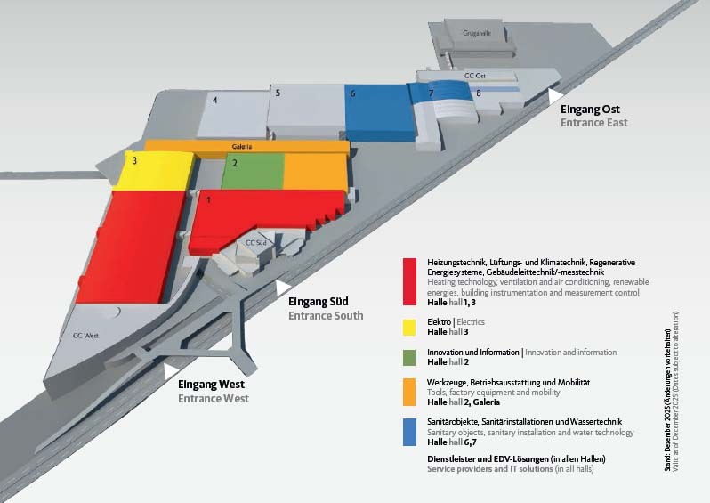 Die Bereiche Heizung und Lüftung sind auf der Messe in zwei Hallen gebündelt (Halle 1 + 3). Hinzu kommen Klimatechnik sowie regenerative Energiesysteme und Gebäudeleittechnik. Außerdem zeigen die Hersteller Heizungen auf Basis von Biomasse, wie zum Beispiel Pellets. Elektrische Heizsysteme, Wärmepumpen und ihre Kombination mit ergänzenden Technologien wie Photovoltaik, Batteriespeichern, Energiemanagement-Systemen und Wallboxen erhalten zusätzliche Fläche (Halle 3). Um Synergien zwischen Strom, Wärme und Mobilität praxisnah zu zeigen, werden sektorübergreifende Lösungen integriert. Der Bundesverband der Deutschen Heizungsindustrie (BDH) ist als Partner mit einem eigenen Stand und Vortragsforum vertreten.