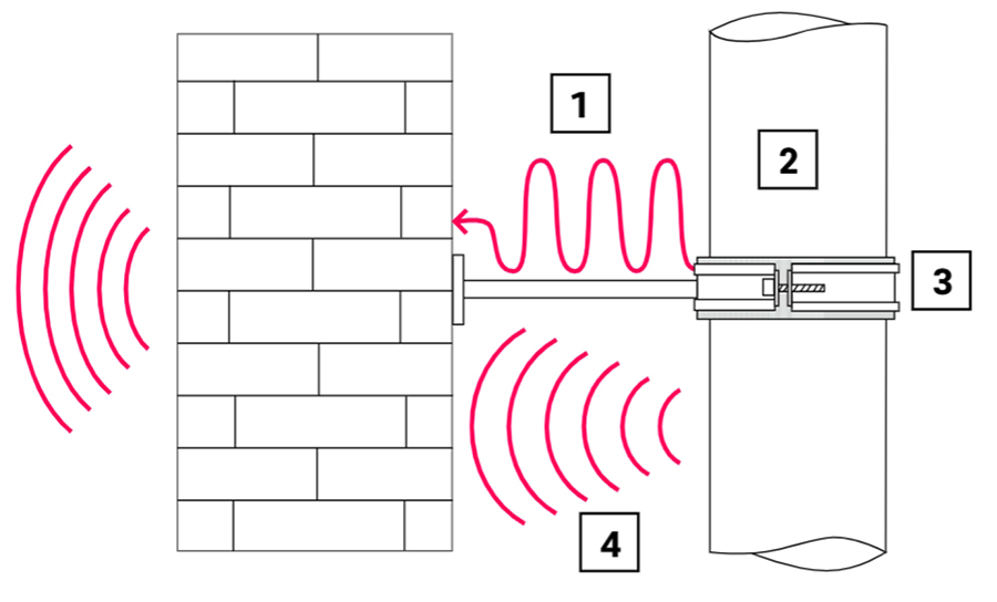 Bild 2: Schallausbreitung bei Abwassersystemen. 1 Körperschallübertragung; 2 Abwasser-Rohr aus PP; 3 Standard-Rohrschelle; 4 Luftschall