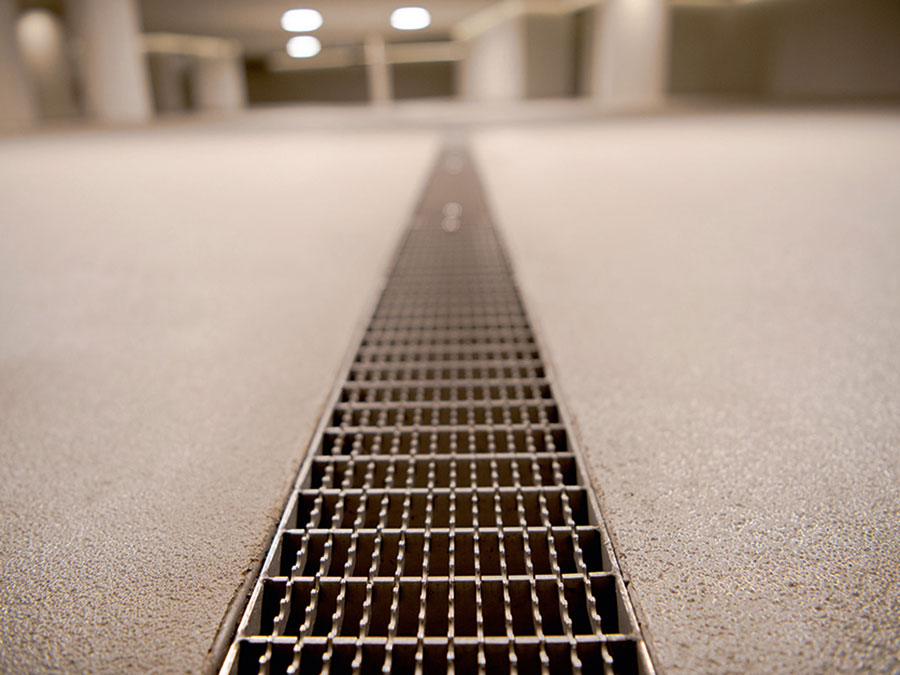 Die Rinne besteht aus Edelstahl V4A. „Das Material, ursprünglich für den Einsatz in der Hochseeschifffahrt entwickelt, hält dauerhaft auch der Einwirkung von Streusalz stand“, betont Aschl. Die Abdeckung ist verschraubt und schützt vor ungewolltem Verschieben oder Manipulation. Die Rinnengeometrie beinhaltet einen zusätzlichen Drainagespalt. Tritt Feuchtigkeit durch Risse im Bodenbelag ein, wird sie gezielt aufgenommen und in das System abgeleitet. So werde verhindert, dass Wasser in den Bodenaufbau eindringt und dort Schäden verursacht, betont Aschl. Für die Verbindung mit dem Bodenbelag sorgt ein gelochter Anschlussflansch, der eine kraftschlüssige Verbindung mit dem Kunstharzboden herstellt. Rinne und Belag bilden eine geschlossene, dauerhaft dichte Einheit.