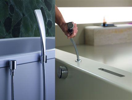 Der Schlauch kann mit einem beliebigen, zur übrigen Badausstattung passenden Brausekopf ausgestattet und entweder im Wannenrand versenkt oder außen anliegend montiert werden.