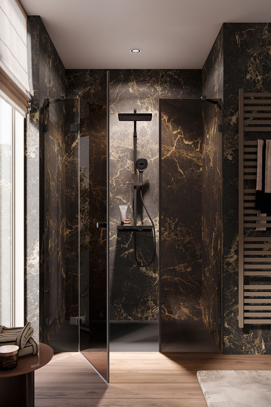 Für die Montage sind die Glaselemente mit Kederprofilen ausgestattet, die einen Verstellbereich von 15 mm ermöglichen und den Ausgleich von Wandtoleranzen unterstützen. Die Serie umfasst unterschiedliche Bauformen, darunter Ecklösungen, Nischen, Drehtüren mit Seitenwand, Walk-in-Varianten sowie Badewannenaufsätze. Bei den Beschlägen stehen mehrere Oberflächen zur Verfügung, darunter Chrom, Schwarz-matt sowie gebürstete Varianten. Ergänzend sind verschiedene Glasvarianten erhältlich, darunter auch getönte Ausführungen wie Bronze. Optional kann eine Glasversiegelung eingesetzt werden, die die Anhaftung von Kalk und Schmutz reduziert.