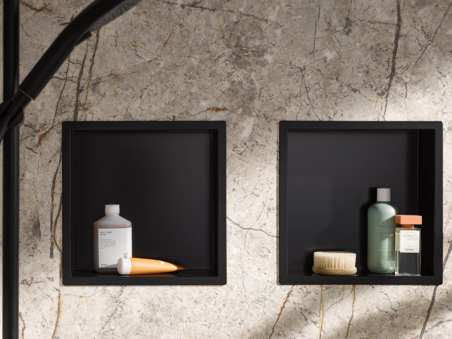 Die Box wird in die Wand integriert und schafft Platz für Utensilien, ohne die Duschzone einzuschränken. Mit Abmessungen von 300 x 300 mm bei 100 mm Tiefe eignet sich die Box sowohl für Duschkabinen als auch für den Wannenbereich. Sie ist in zwei Rahmenvarianten erhältlich: Chromoptik mit Rückwand in Arctic-Weiß oder Aschgrau sowie Schwarz-matt mit Rückwand in Samt-Schwarz. Mehrere Boxen können kombiniert werden, um zusätzliche Ablagefläche zu schaffen und die Gestaltung des Duschbereichs zu variieren.