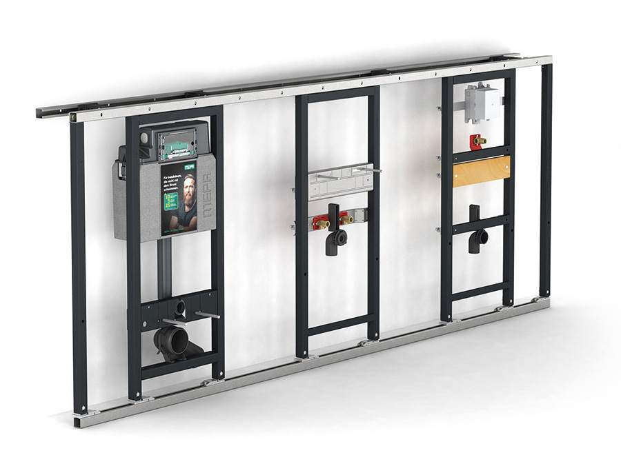 Zu den Waschtisch- und Urinalelementen: Die Traversen für den Wasser- und Abwasseranschluss sowie die Befestigung der Keramik können laut Mepa werkzeuglos und rutschfest mit nur einer Hand auf die erforderliche Höhe geschoben werden. Anschließend werden sie mit zwei Flügelschrauben fixiert. Mit flexiblen Anschlüssen und einer für alle Wandscheiben passenden Universalhalterung sind die Elemente „mit allen Trinkwasserrohrsystemen kompatibel“.