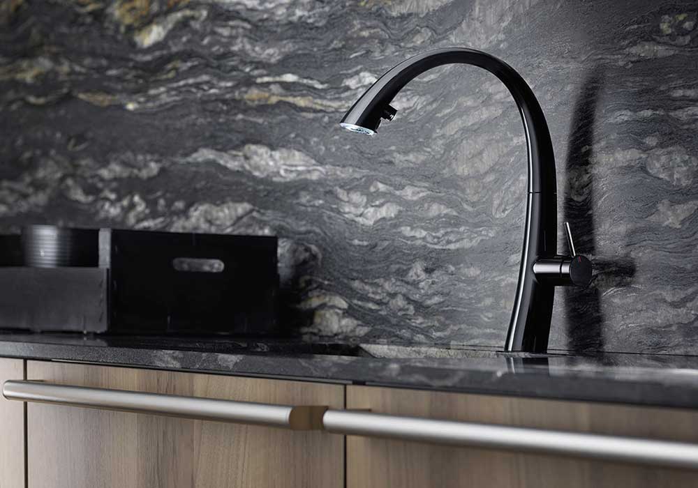 Die Armatur „ZOE“ des Schweizer Herstellers KWC ist ab sofort auch in der Ausführung Matt Black erhältlich. Für das Unternehmen ist die Küchenarmatur ohnehin ein Hingucker.
