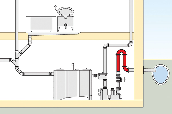 Befindet sich der Ruhewasserspiegel des Fettabscheiders unter der örtlich festgelegten Rückstauebene, ist mithilfe einer Abwasserhebeanlage für eine ausreichende Ableitung zu sorgen. Im Falle eines Rückstaus entstehen sonst, durch in die Räumlichkeiten austretendes Wasser, Schäden an Gebäude und Anlagentechnik. Im gewerblichen Bereich muss die Abwasserhebeanlage stets als Doppelpumpenanlage ausgeführt sein. Darüber hinaus sollte sie über eine geeignete Niveauerfassung verfügen. Hier empfehlen sich Systeme wie die Staudruckmessung mit Lufteinperlung oder eine hydrostatische Messung. Schwimmerschaltungen sind aufgrund der sich im Arbeitsbehälter bildenden Schwimmschicht nicht zu empfehlen.