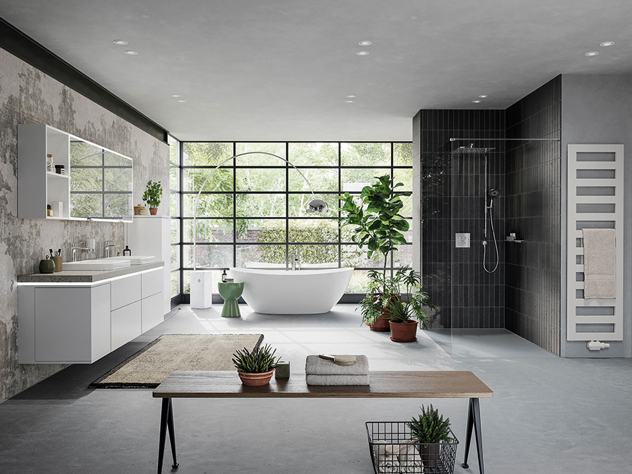 Für trendorientierte Bäder bietet die Linie reduzierte Geometrien und wandhängende Möbel, die eine klare Raumwirkung unterstützen sollen. Offene Duschbereiche lassen sich flächenbündig integrieren.